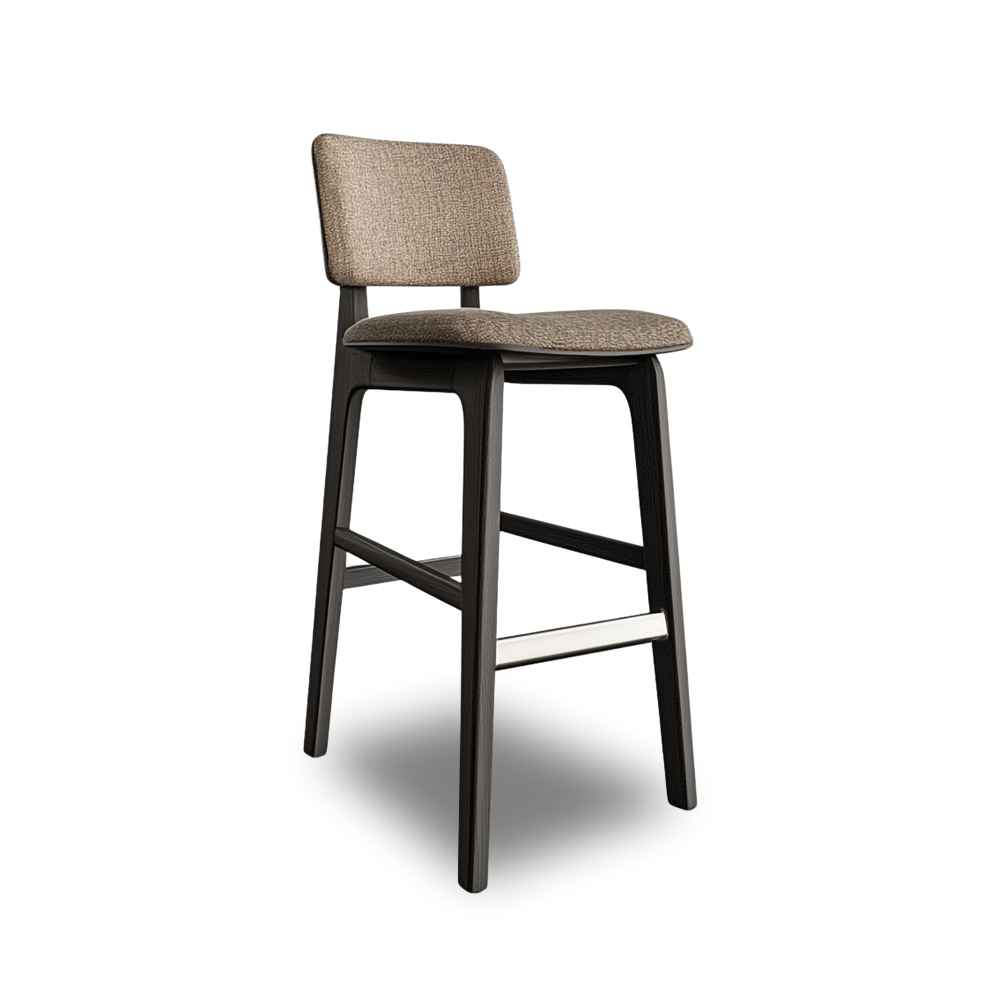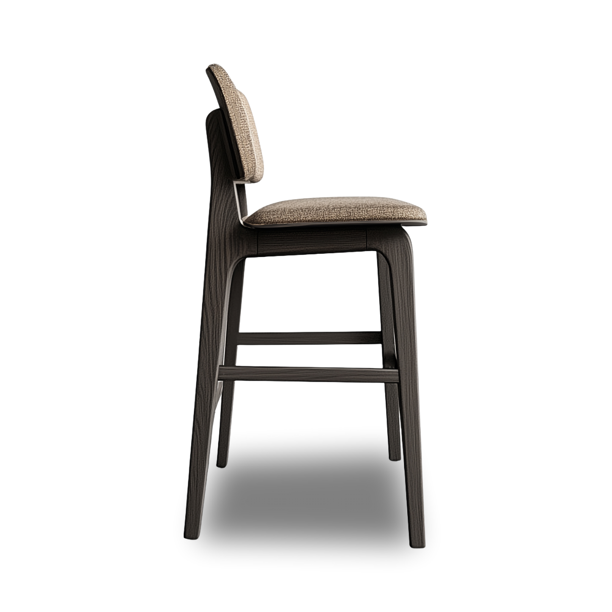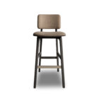 - Tightly upholstered counter stool with wood base and stretchers